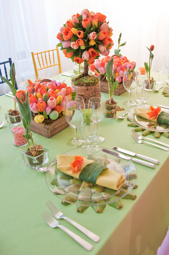 Najpoužívanejšie sú tulipány určite na výzdobu stolov. Na stoloch budú vyzerať fantasticky, či už jednotlivo vo vysokých farebných vázičkách, alebo vo väčšom množstve v rozličných farbách, v prútených košíkoch či vázach rozličných tvarov. Nám osobne sa veľmi páči veľká sklenná váza, v ktorej sú tulipány len skrútené, vyzerá to veľmi efektne a pritom je to absolútne jednoduché.